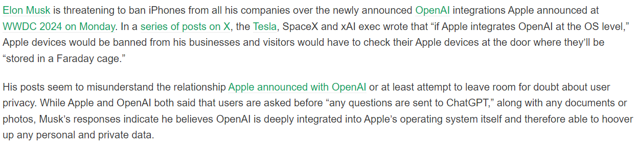 Elon Musk threatens to ban Apple devices from his companies over Apple’s ChatGPT integrations